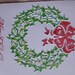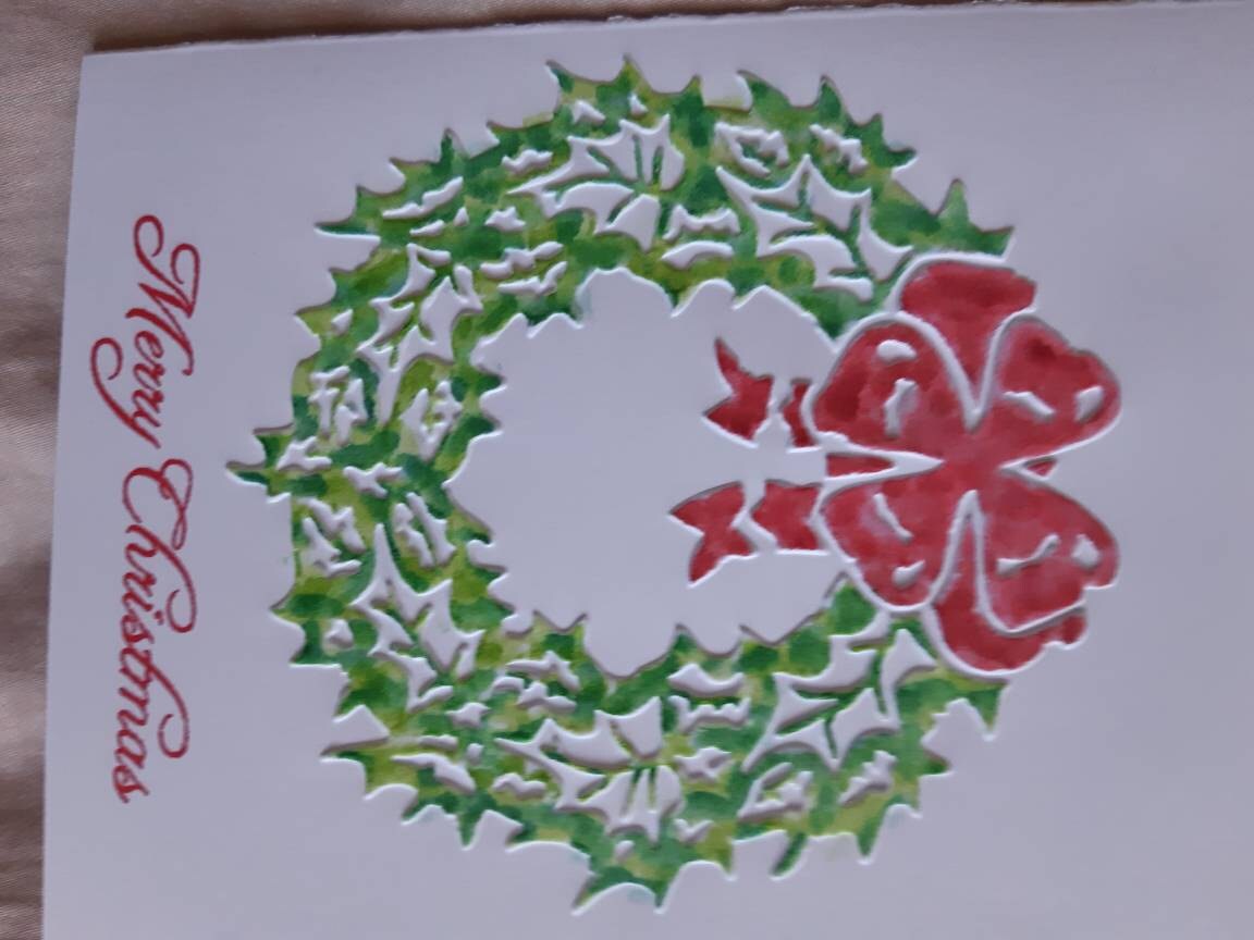 Each card is hand painted using a water pen to blend the Tim Holtz distress ink colours; mowed lawn and pine needles for the greens and festive berries and aged mahogany for the reds. The cards are all the same, but the blended colours are each a little different.
