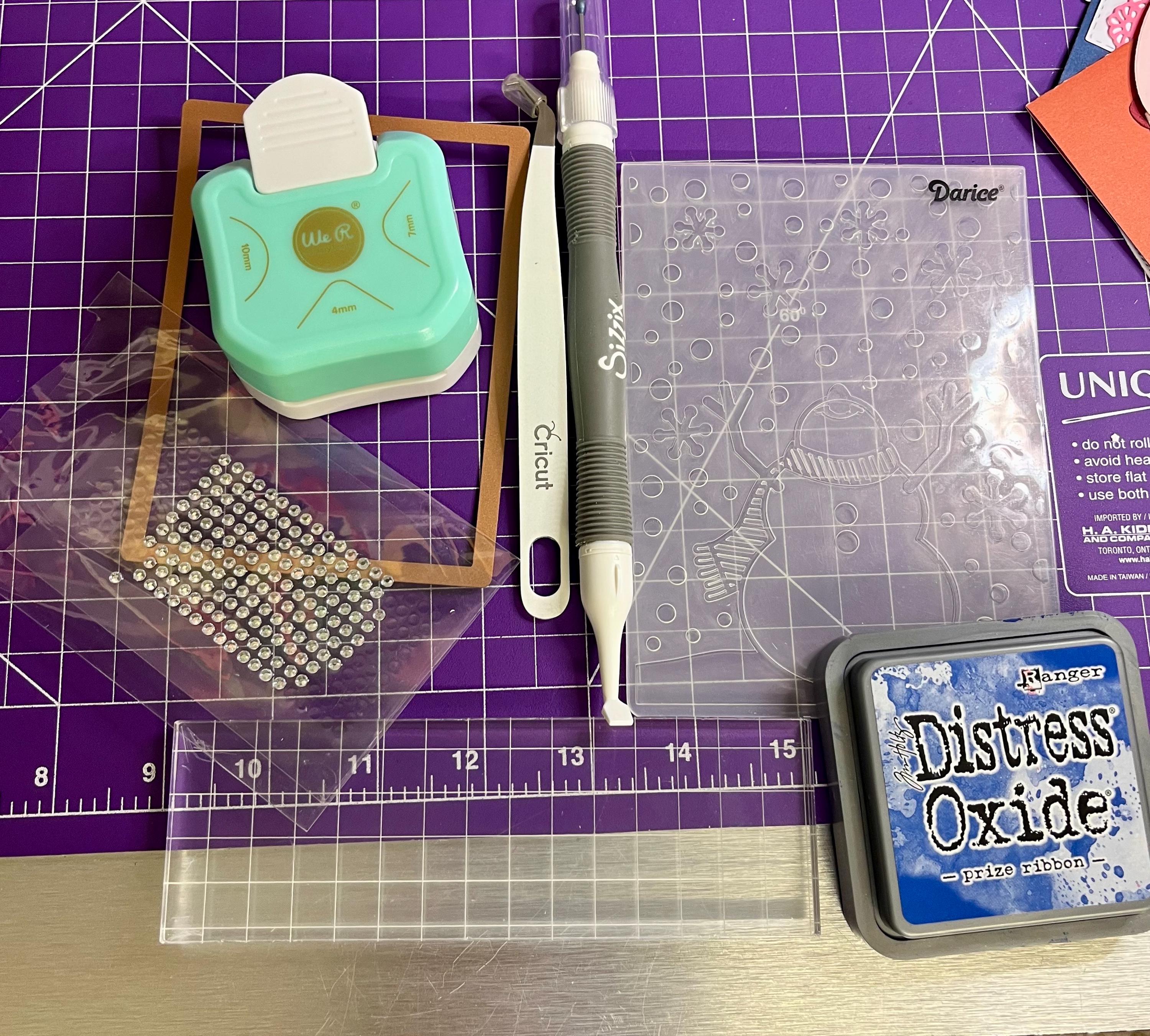 I added another layer of light blue card stock for colour. The edges are paper punched to create rounded edges. To finish I added five clear rhinestones for sparkle and stamped Merry Christmas with distressed oxide ink colour prized ribbon.💙💙