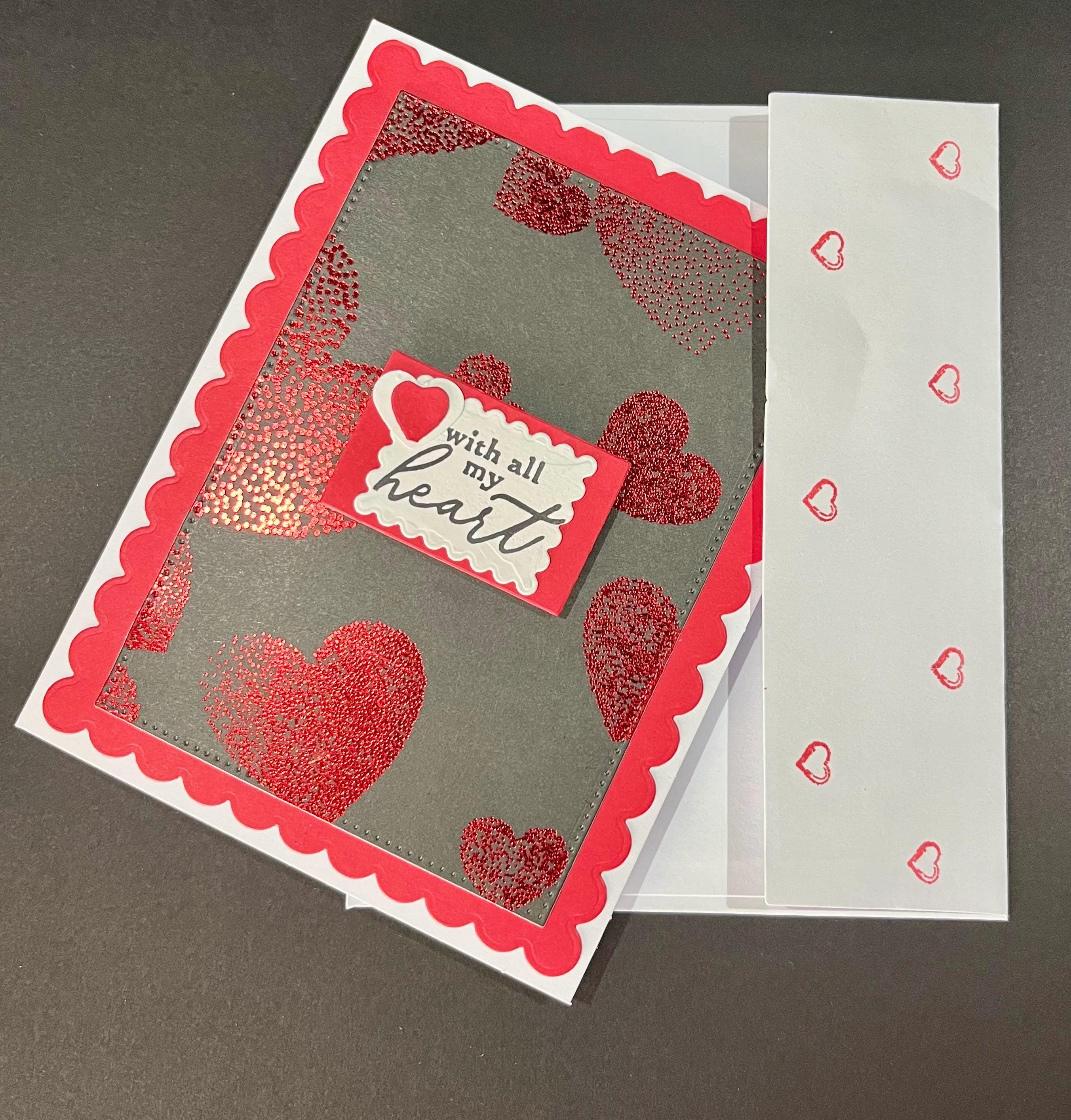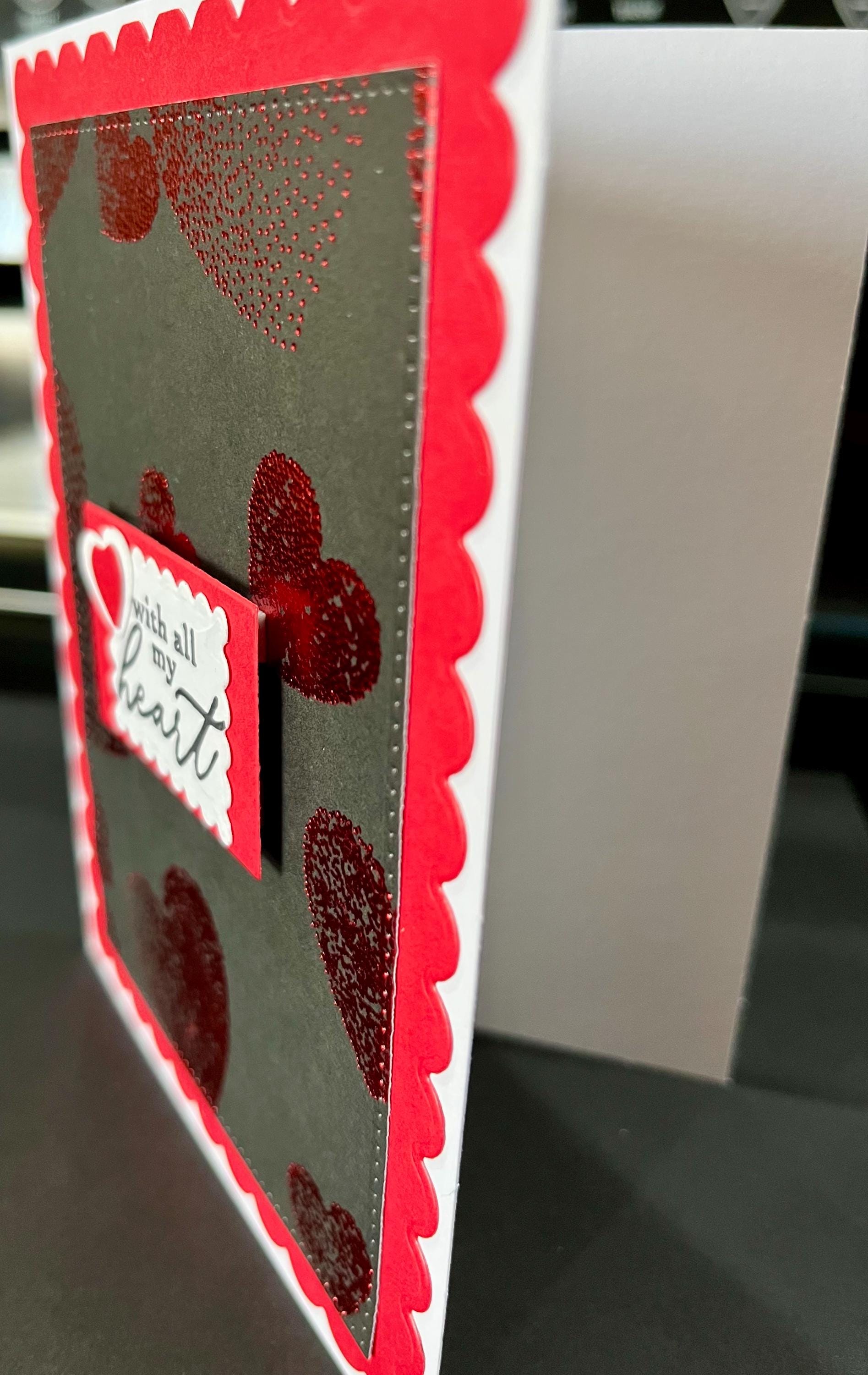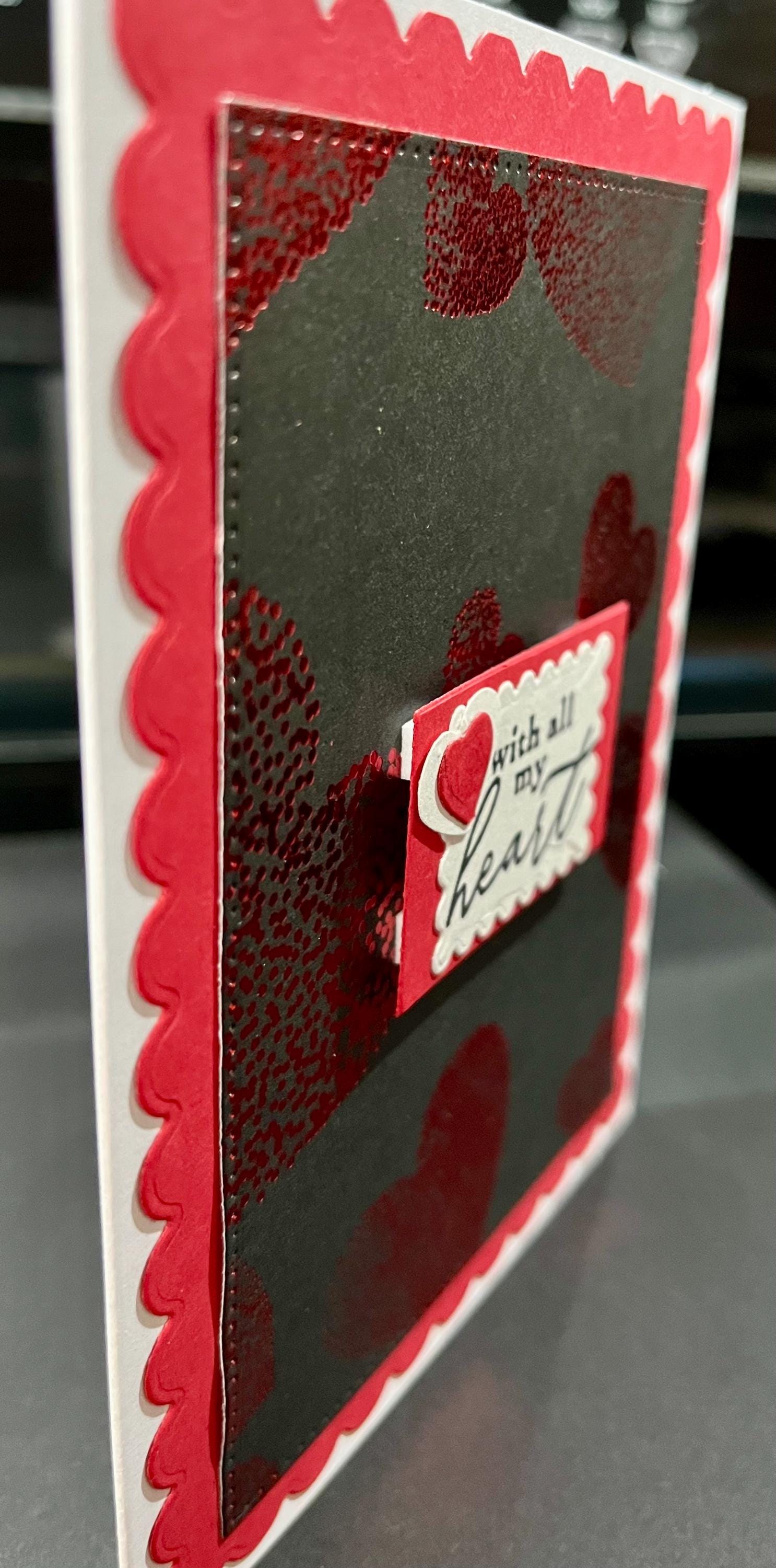 Next is pattern paper that has red foil hearts on black card stock. The paper has also been die cut with a stitched edge rectangle die.❤️☺️
