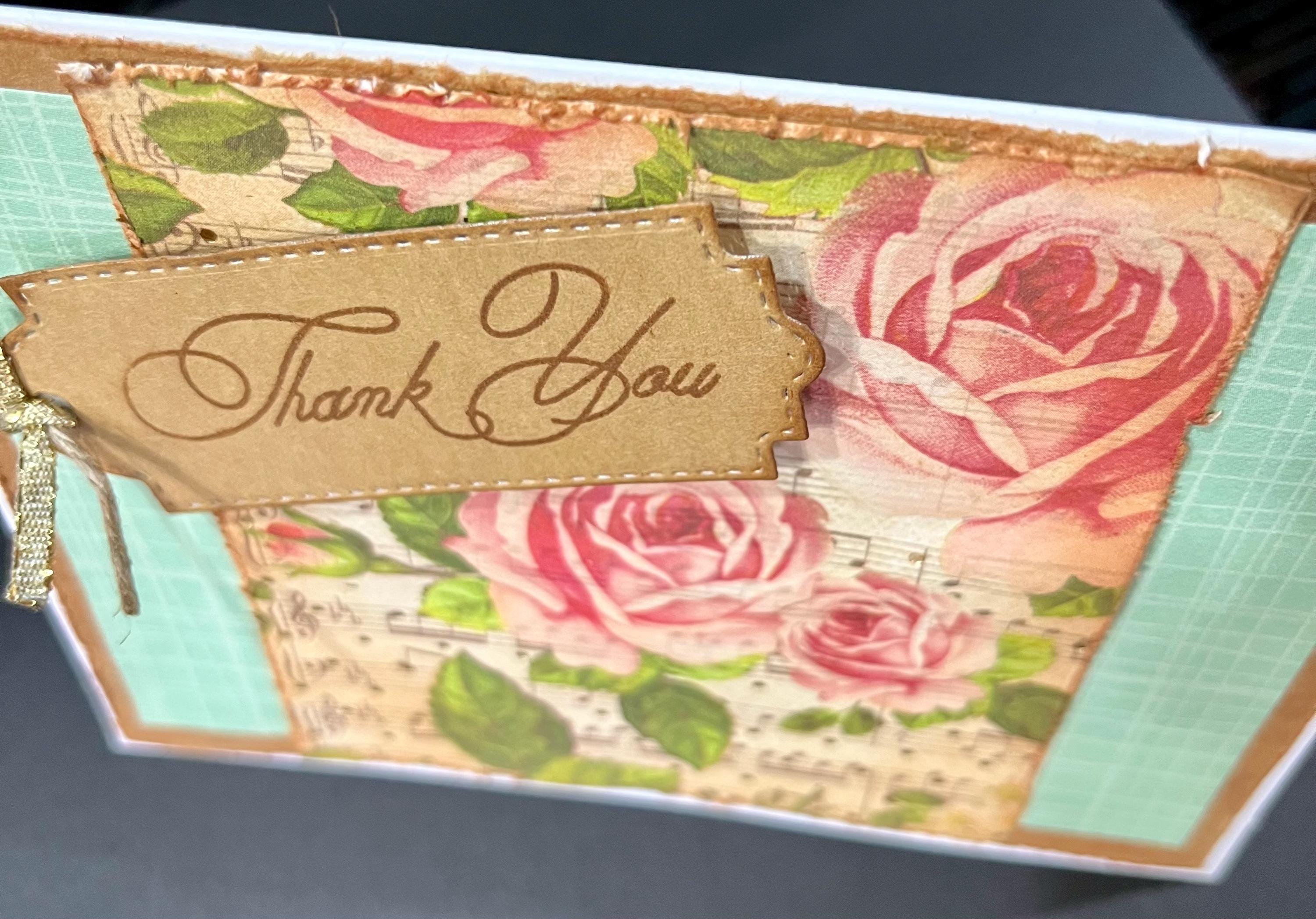 The stitched die cut bookmark tag contains the sentiments Thank You, stamped with distress ink colour vintage photo and finished with a small piece of hemp cord and shimmery gold ribbon tie on the end.๐๐น