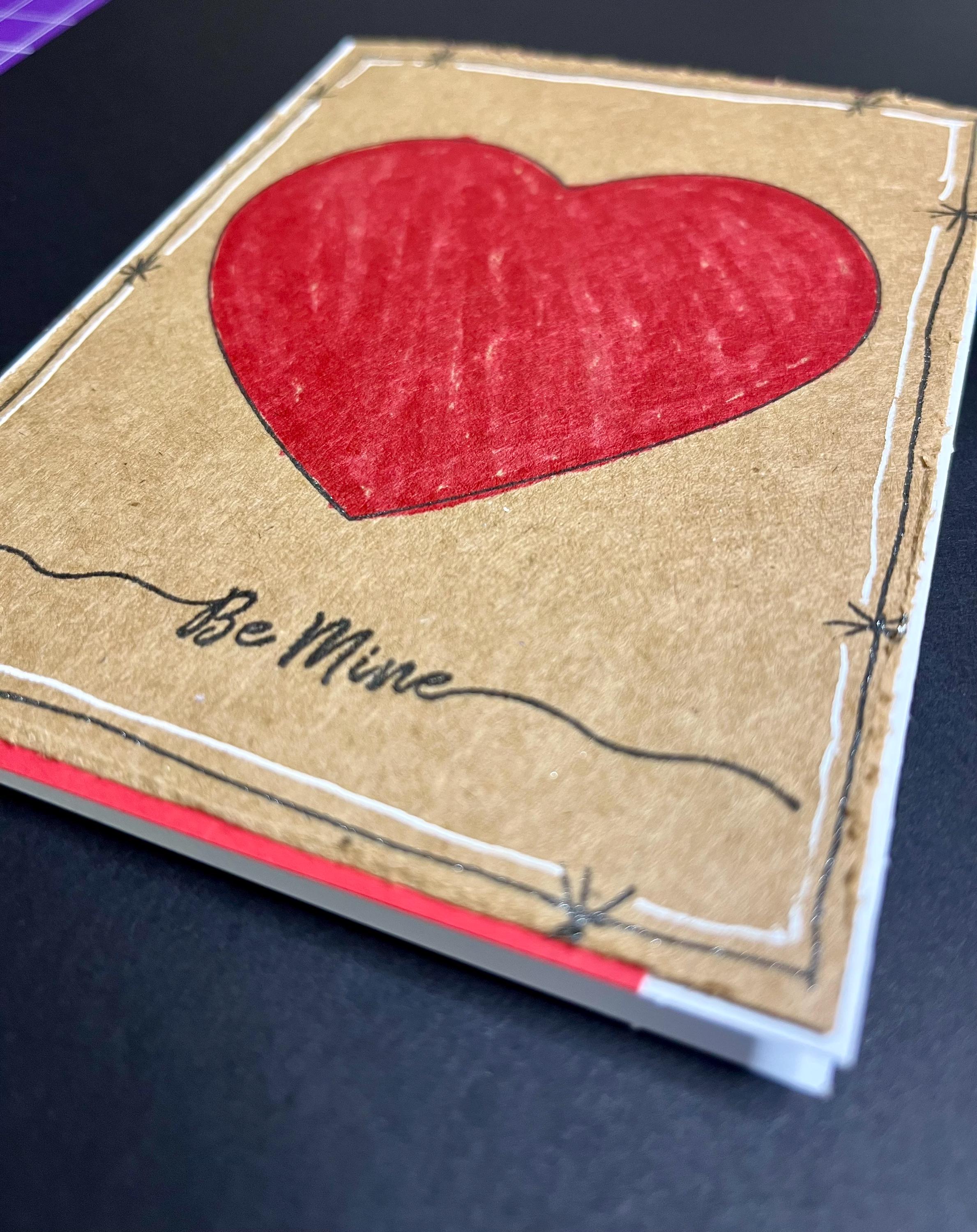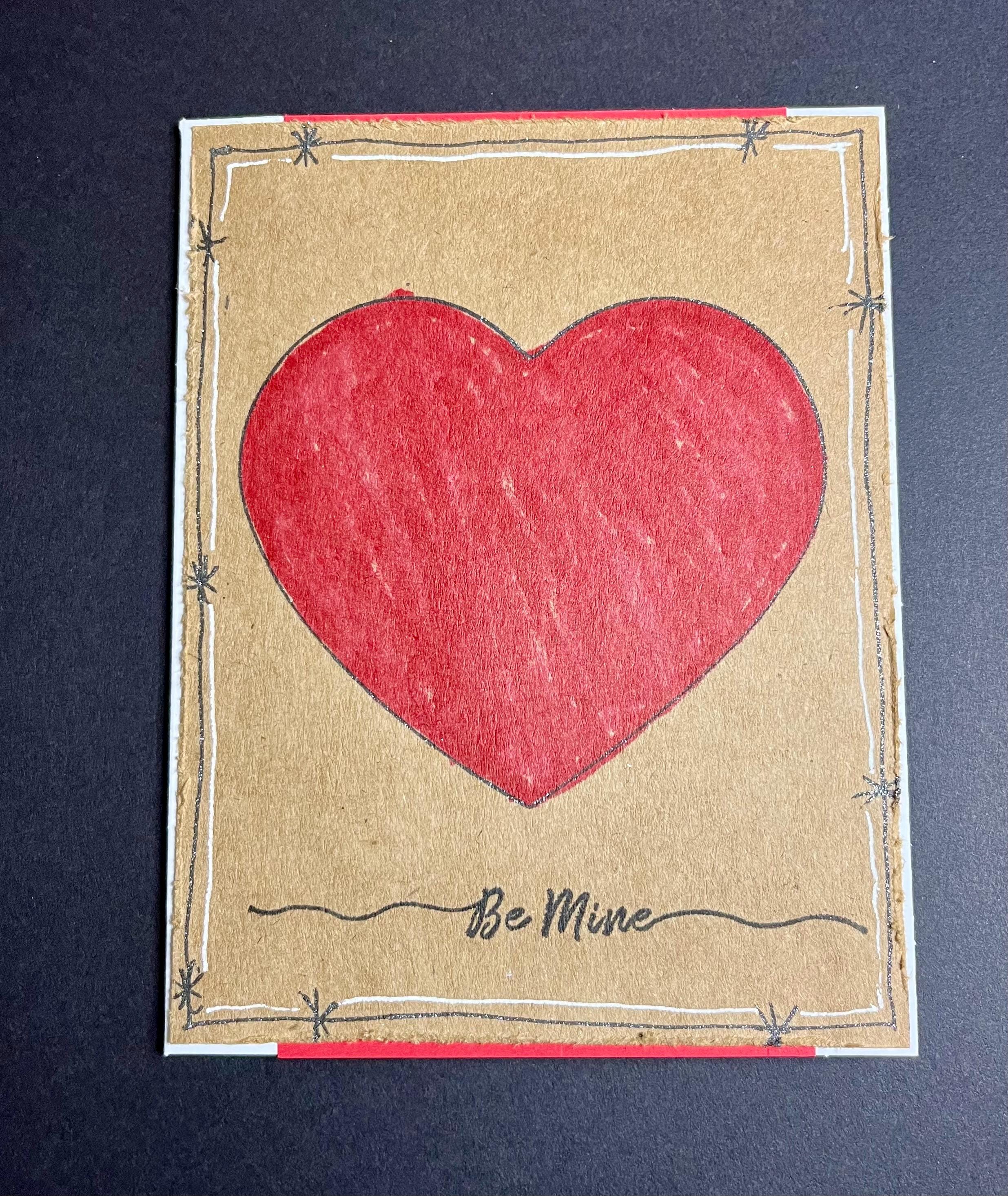 The sentiment Be Mine , has been stamped with distress ink colour Black Soot.