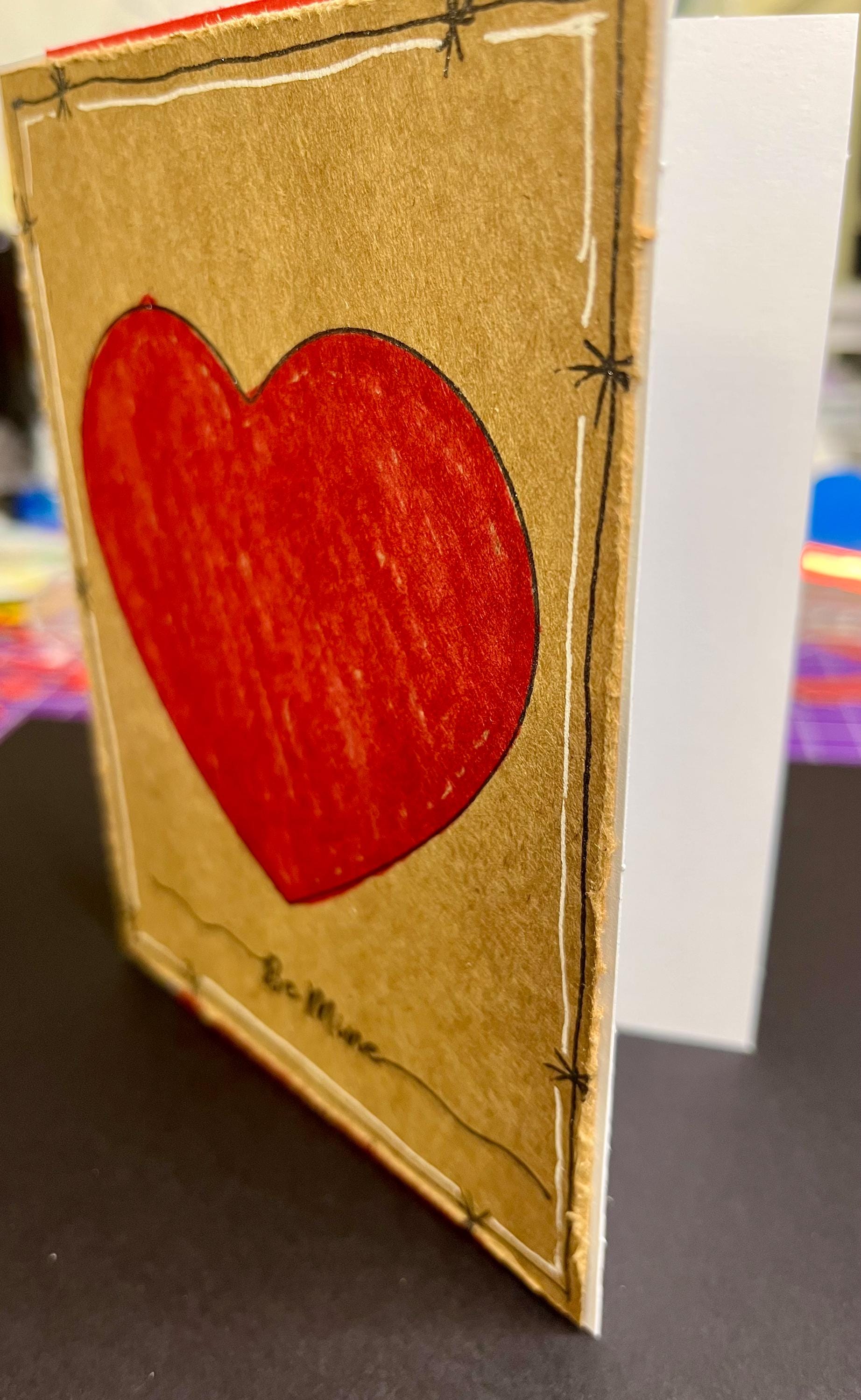 Next is brown stock and using a stencil , I traced a heart with a black glitter gel pen. The heart is coloured with a alcohol marker , colour Deep Red.