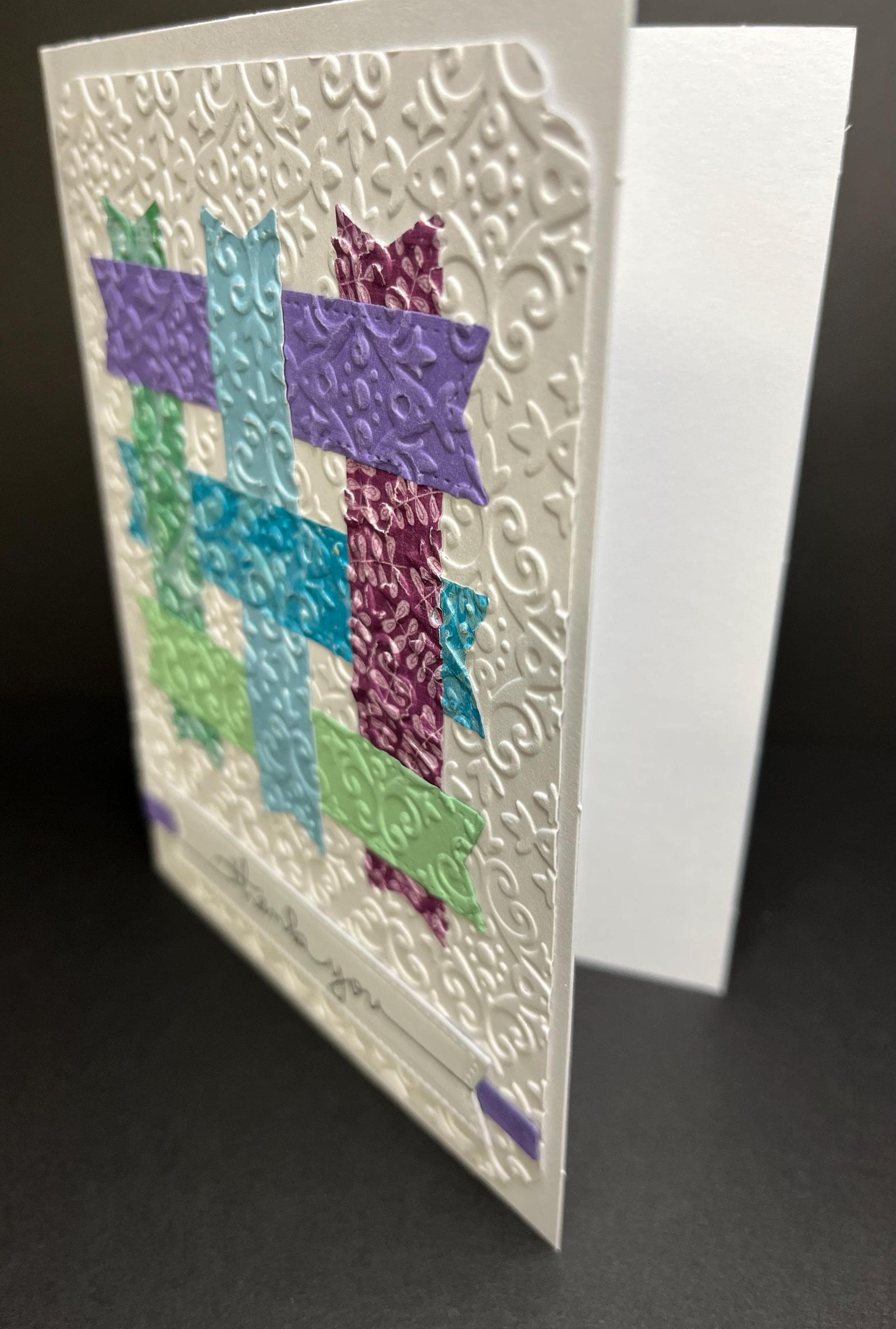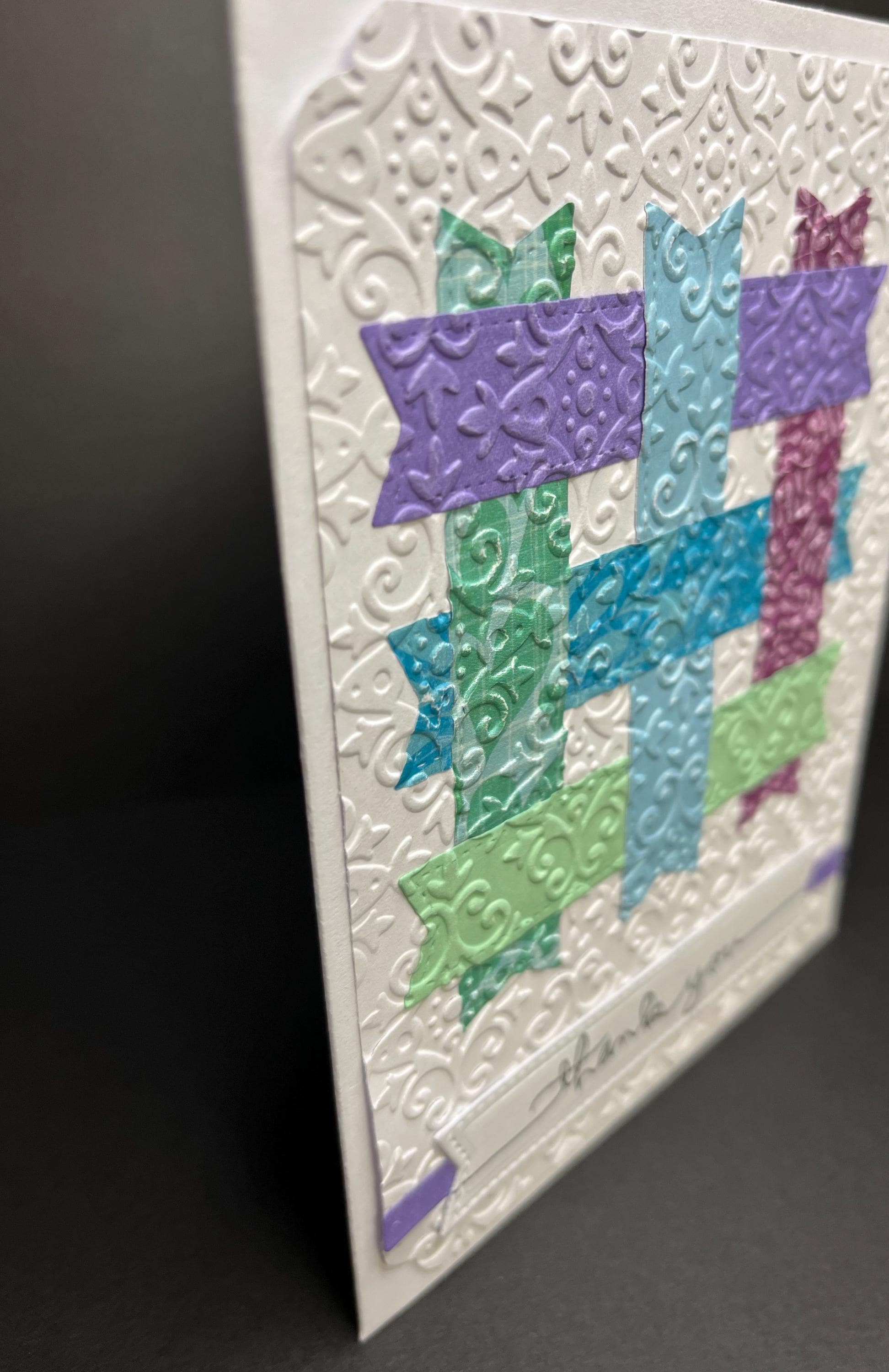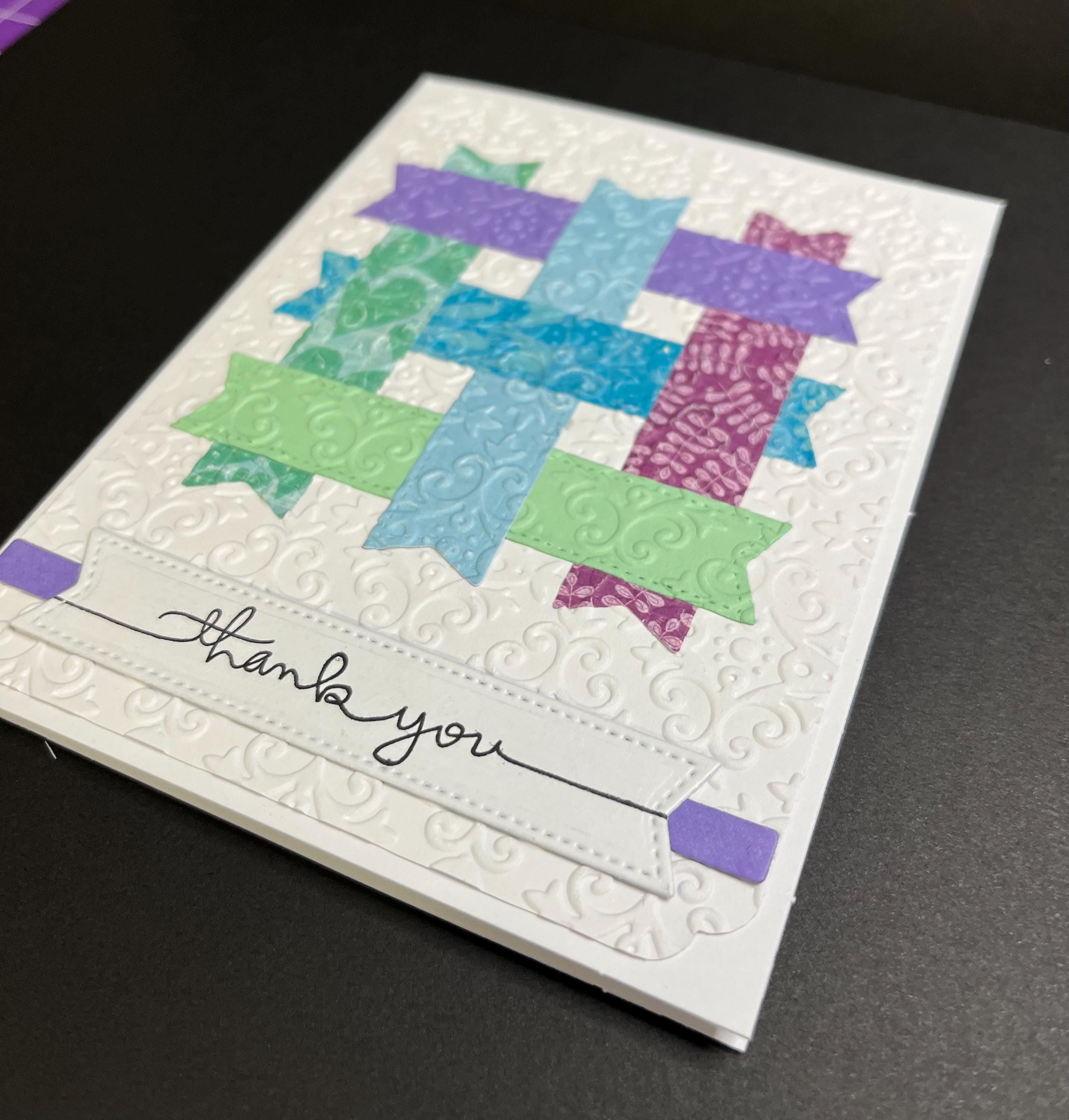 Next is six die cut fishtail banners, I chose the colours blue, purple, and green. Three of them are pattern paper and the other three are solid colour. I have woven the banners and attached them to the white card stock, then embossed it with the classic rhombus pattern folder to give it the quilt look.🩵💜