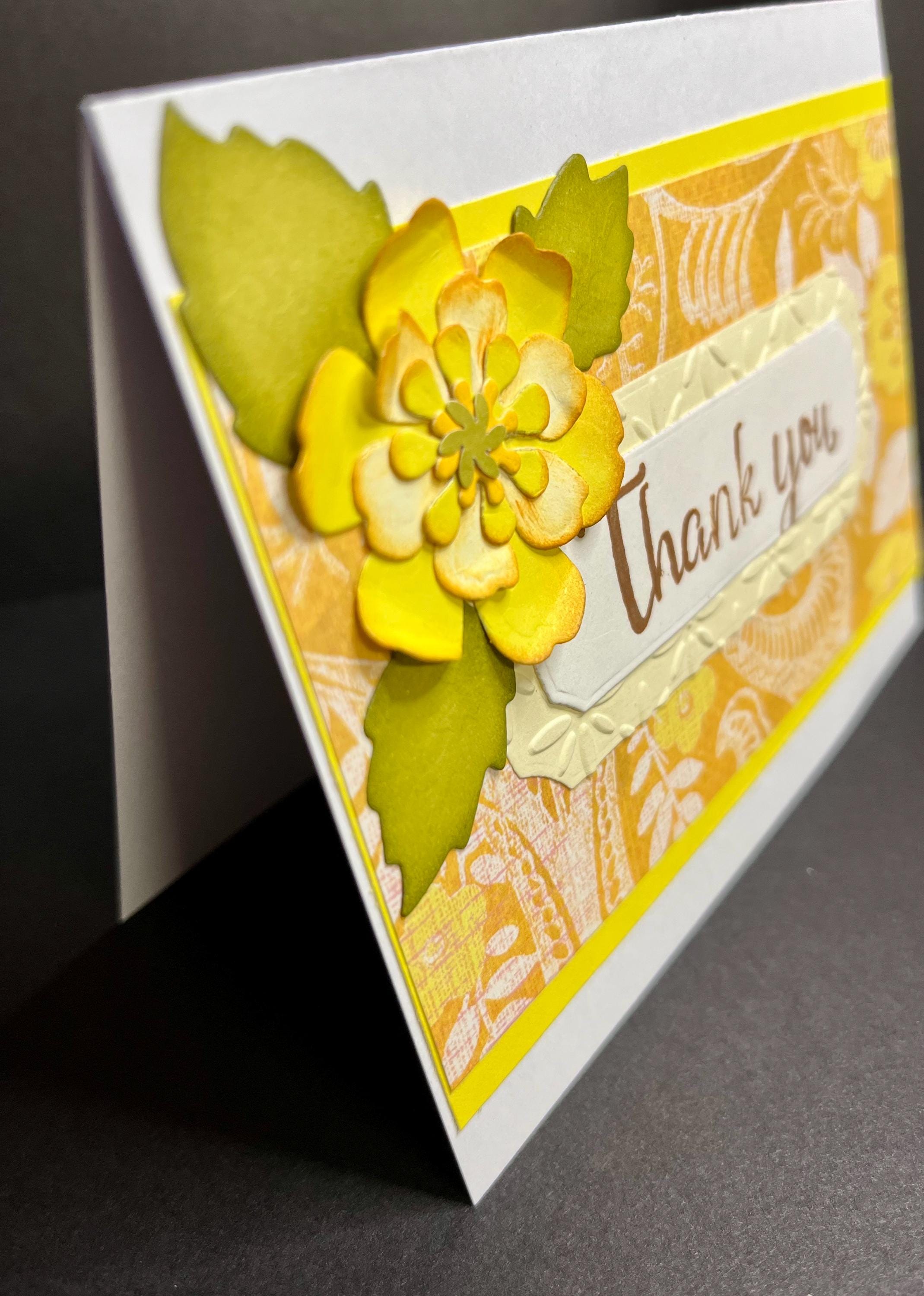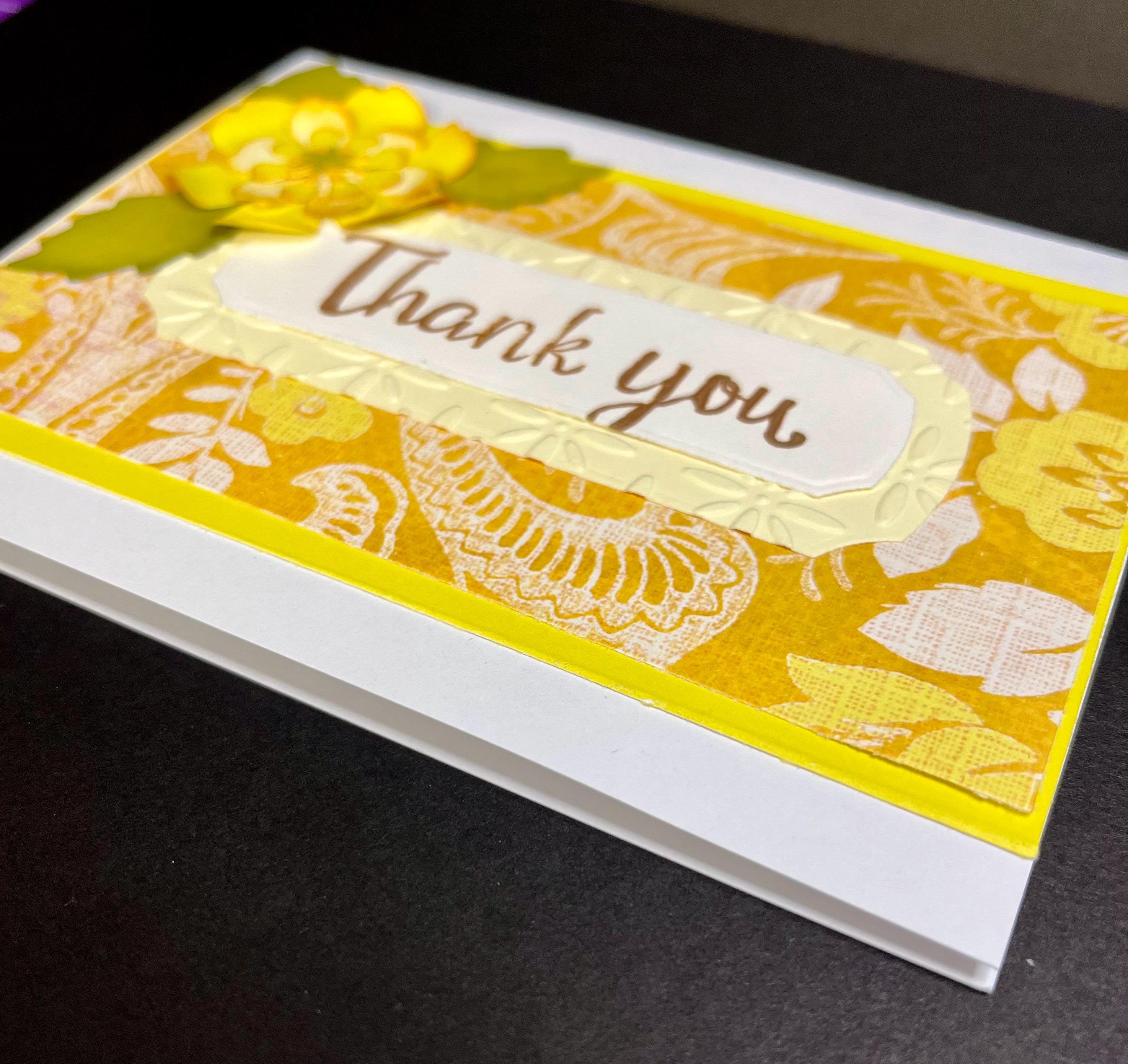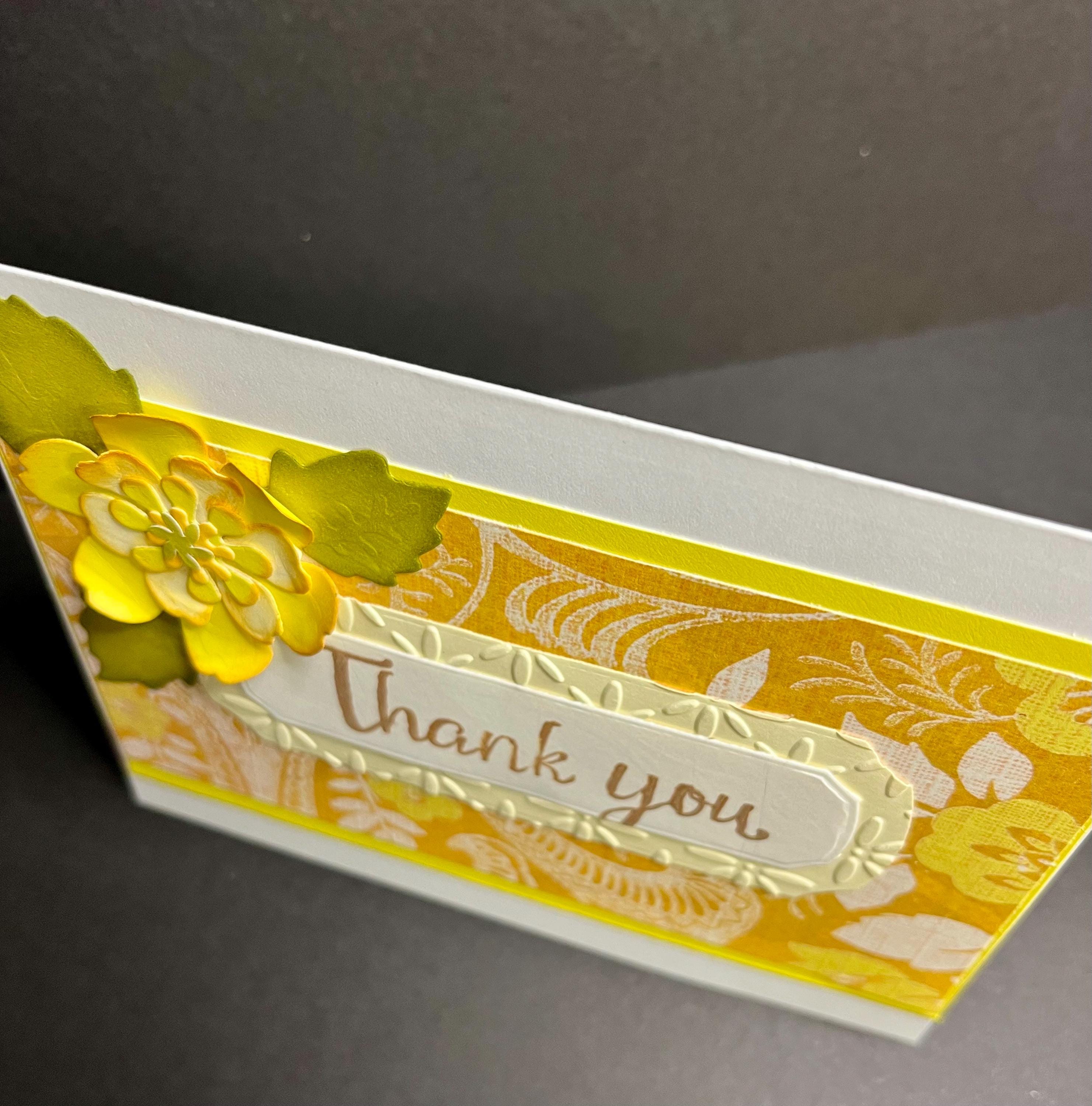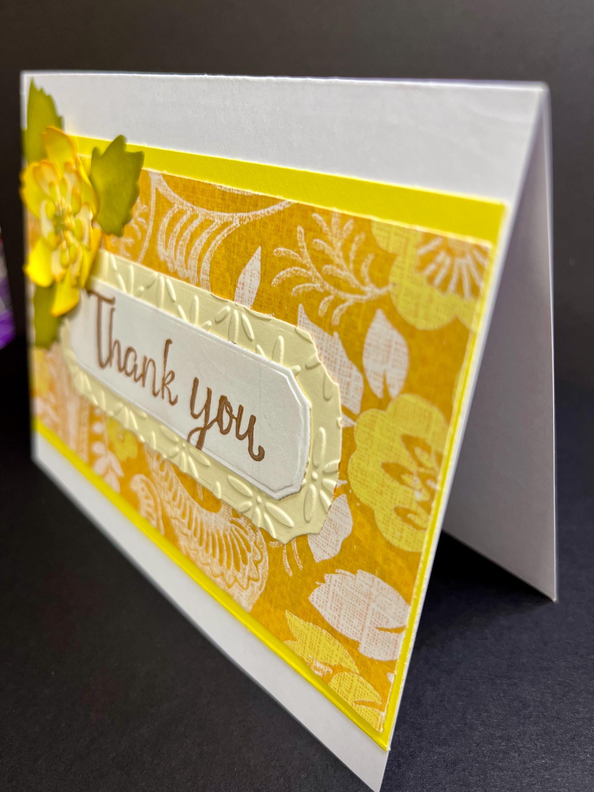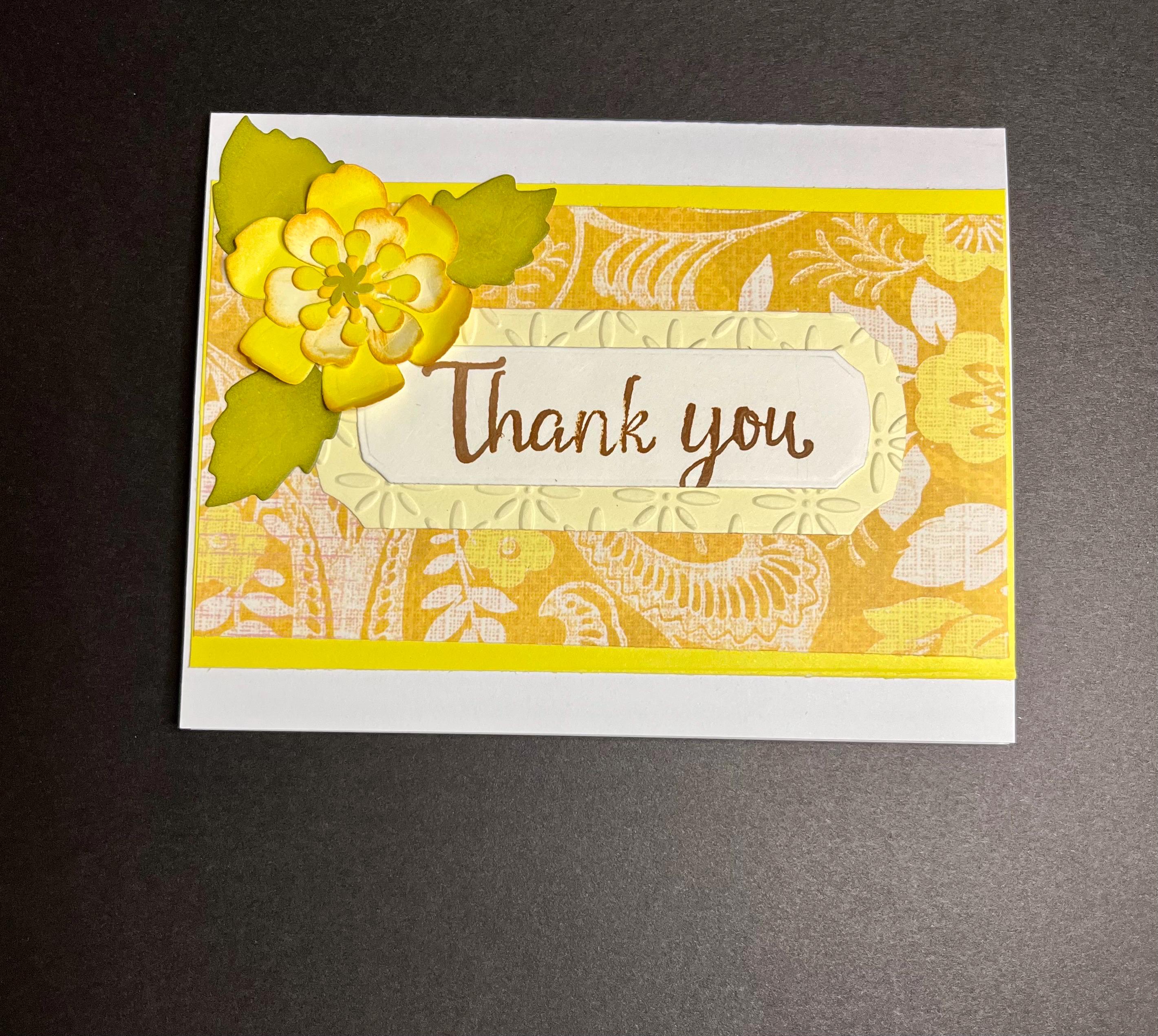 Using a long rectangle banner die cut, I cut two. One in a soft butter yellow card stock, and then embossed with baby’s breathe using a folder. The other one in white card stock, that has the sentiment , Thank You, stamped with distress oxide colour Vintage Photo.🌼🤎