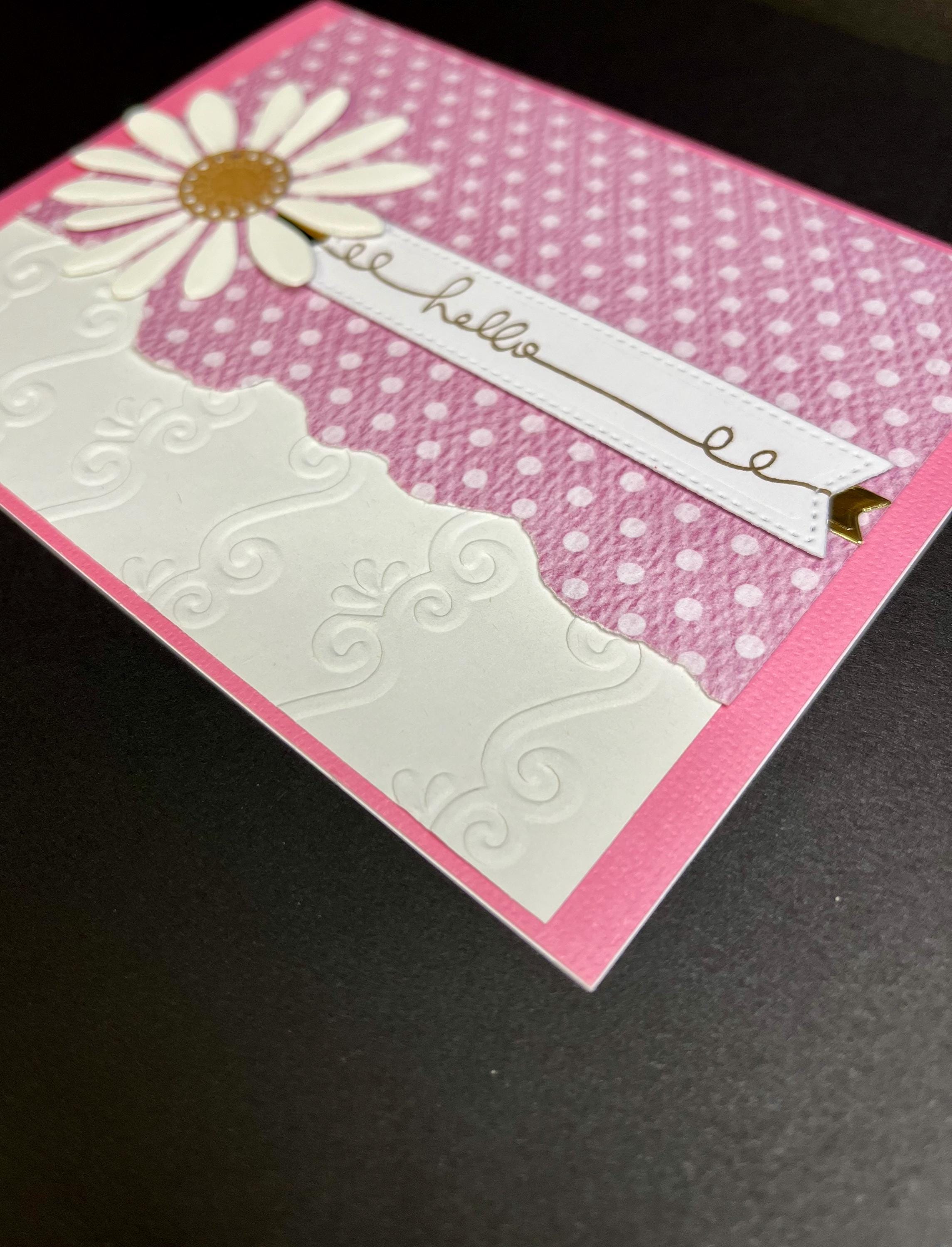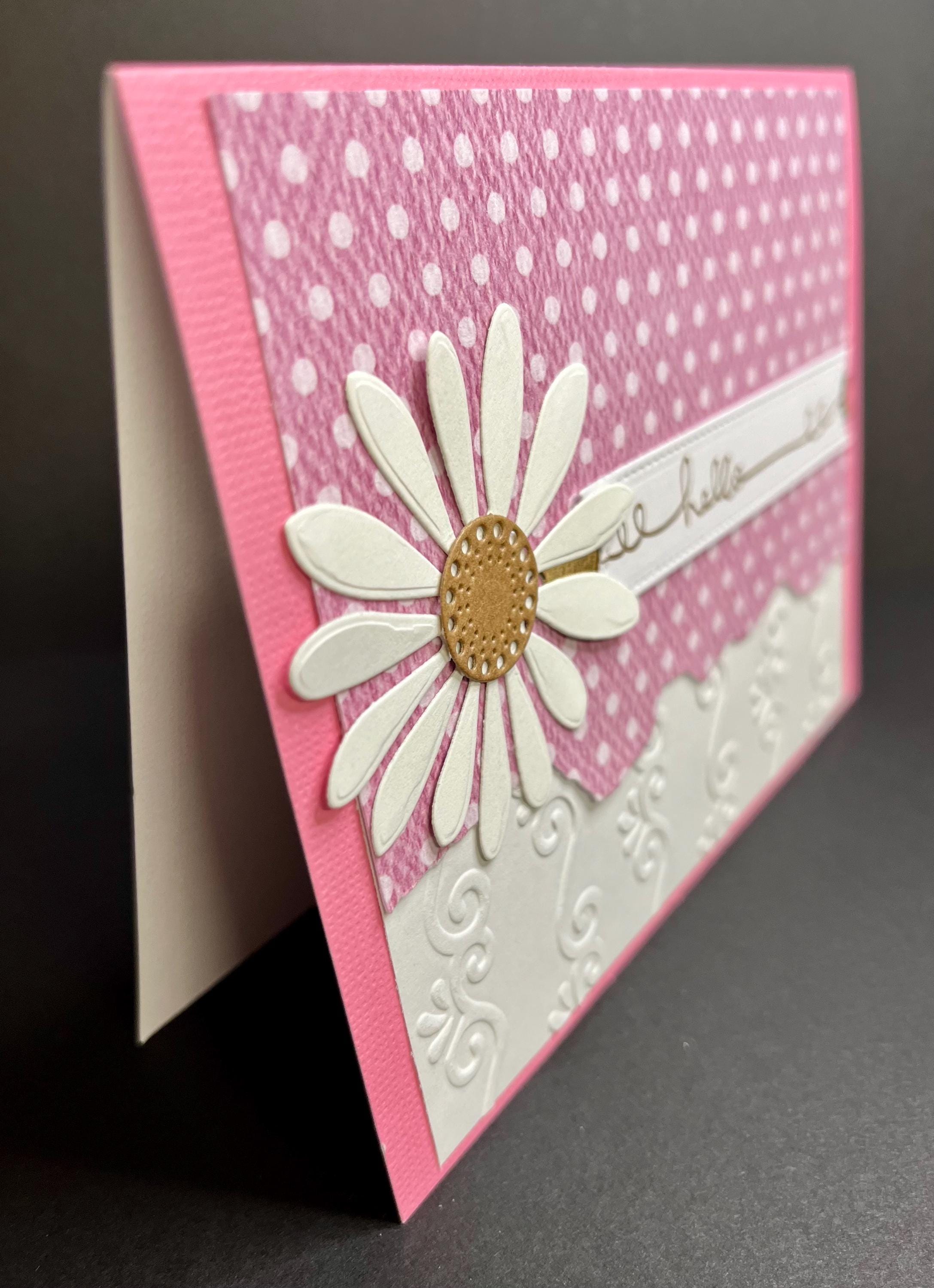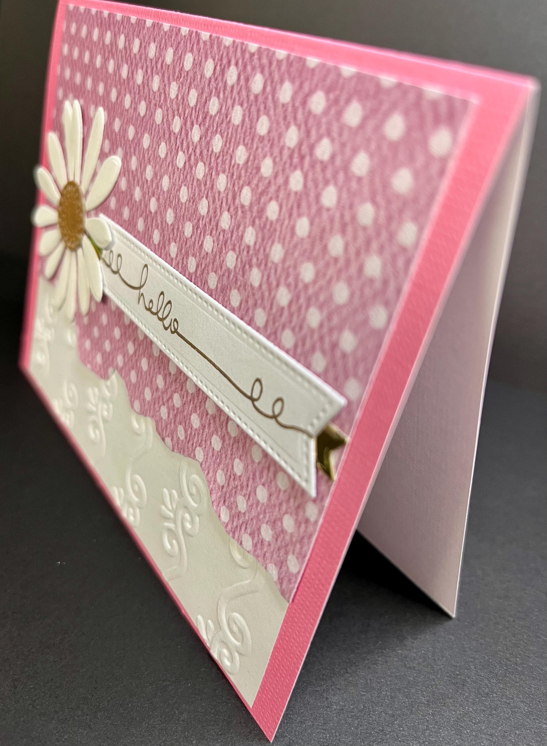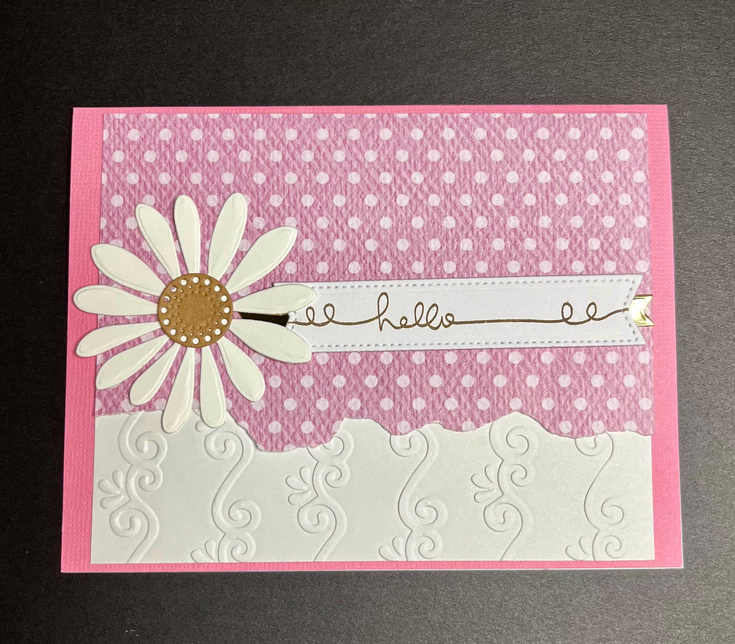 The soft pink polka dot pattern paper that has the edge torn is layered with white card stock , that has been embossed using a folder called Flourishes.💕🌼