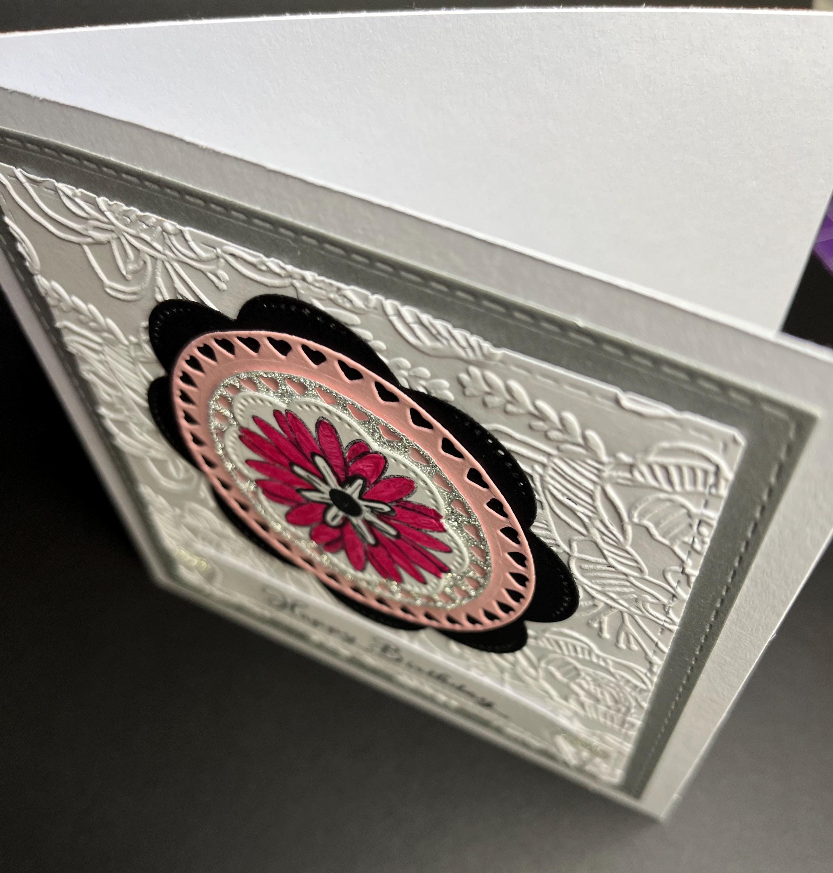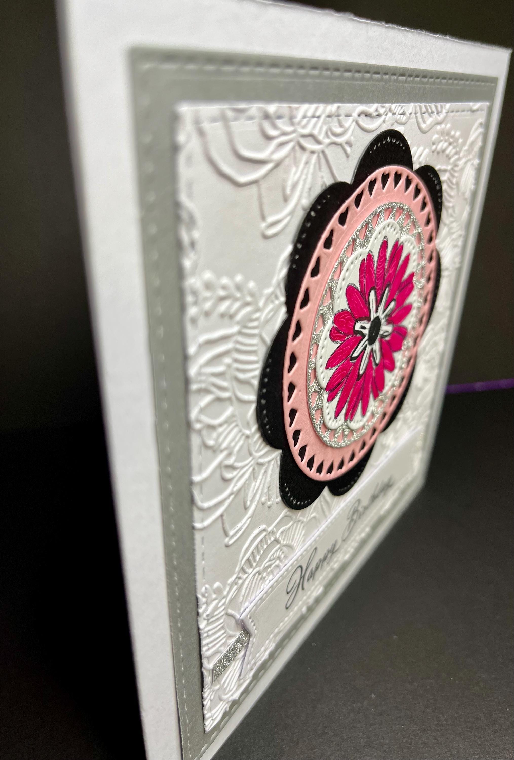 The other two layers are die cut circles with heart border. One in soft pink and the one sparkling silver.๐