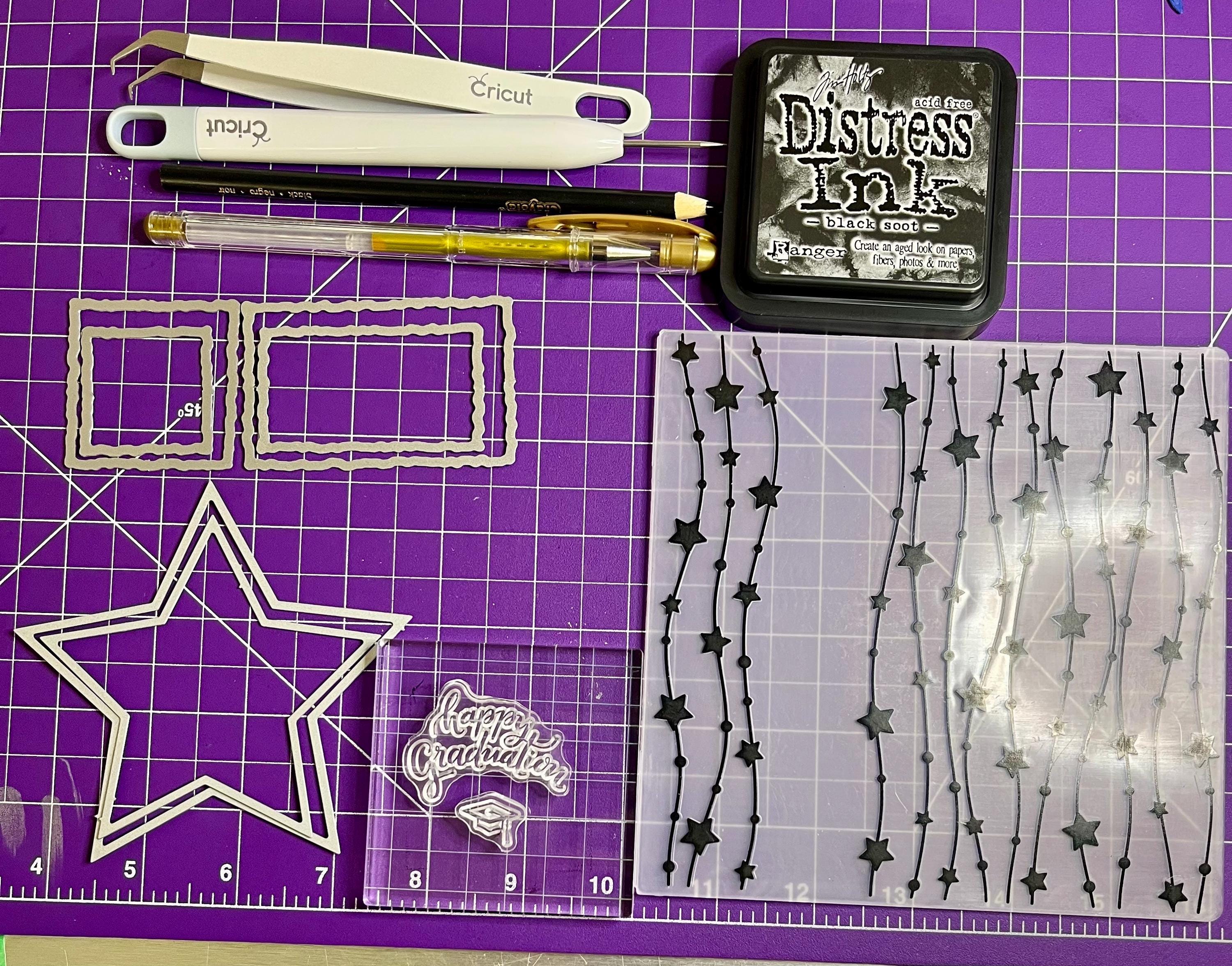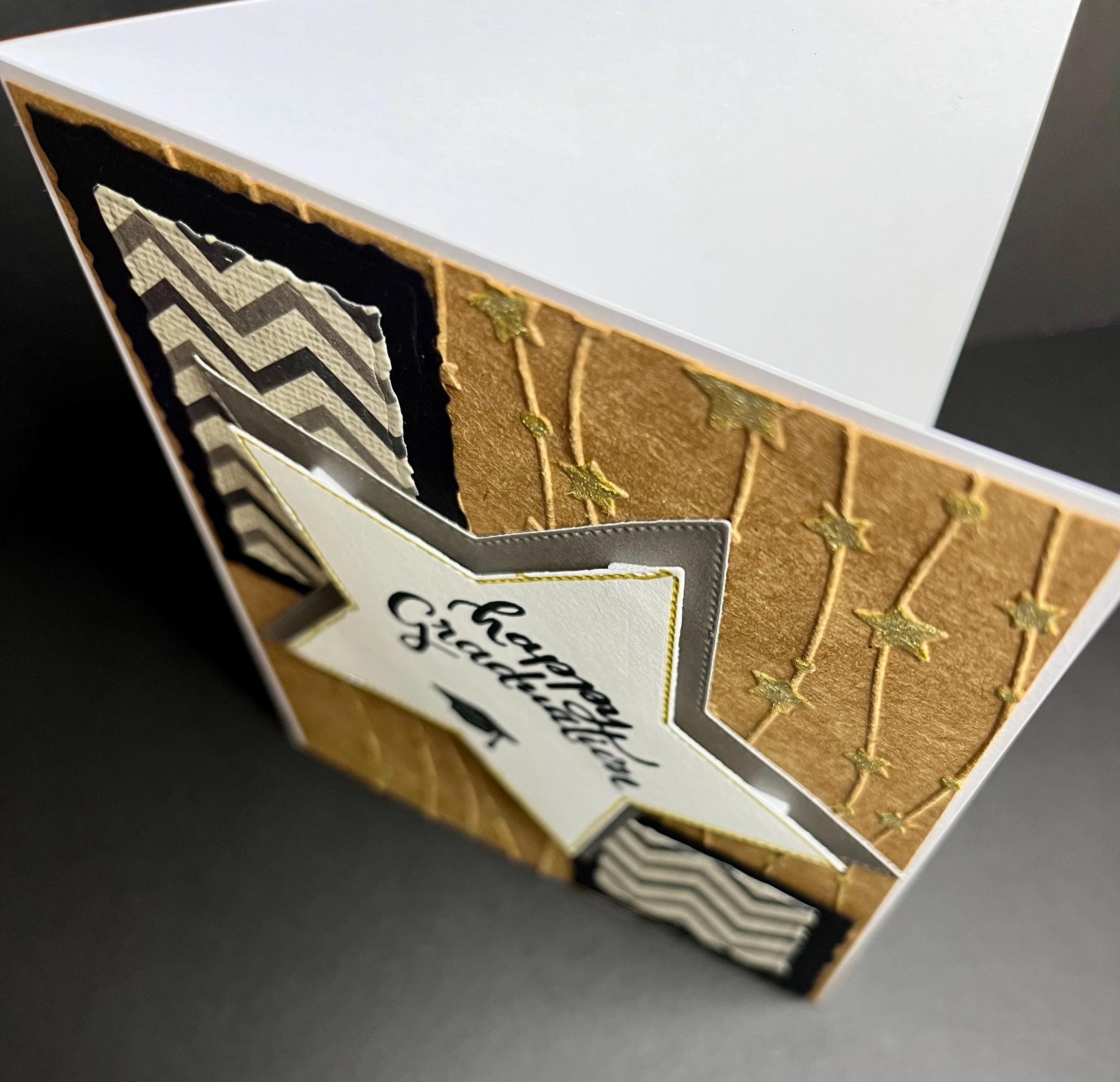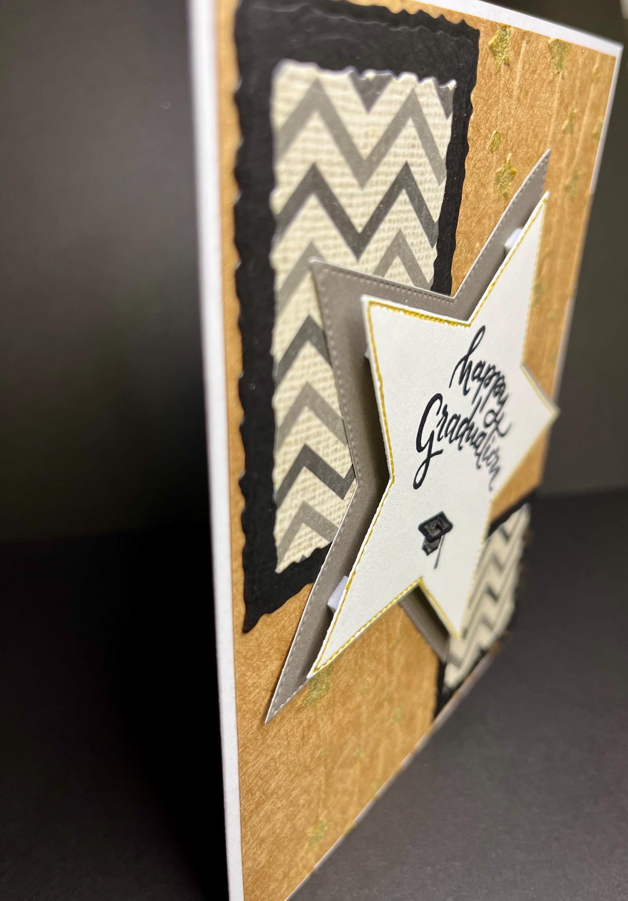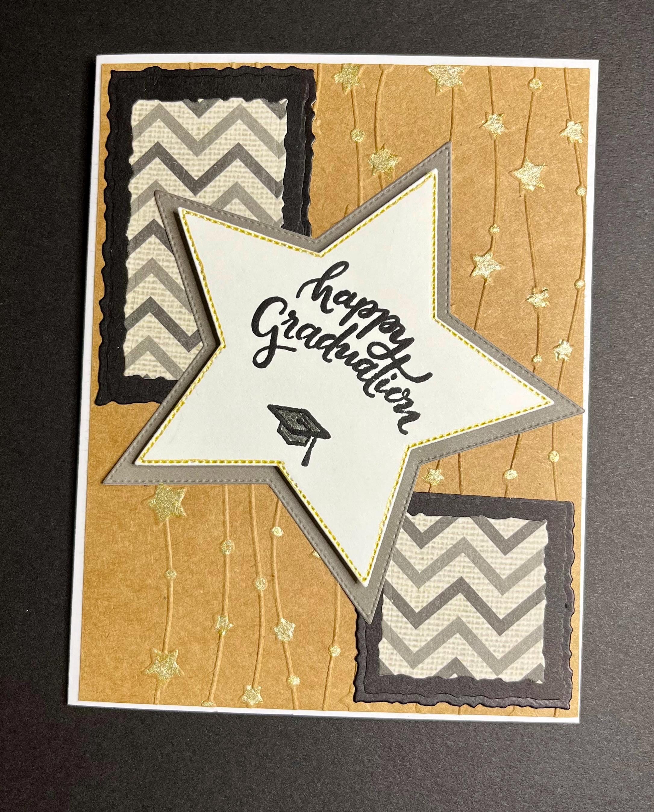 The center of the card is two stitched die cut stars. One in gray and the other in white. The white star has the edges line with gold glitter gel pen and the sentiment , happy graduation with a grad cap, stamped with distress ink black soot.🎓🎓