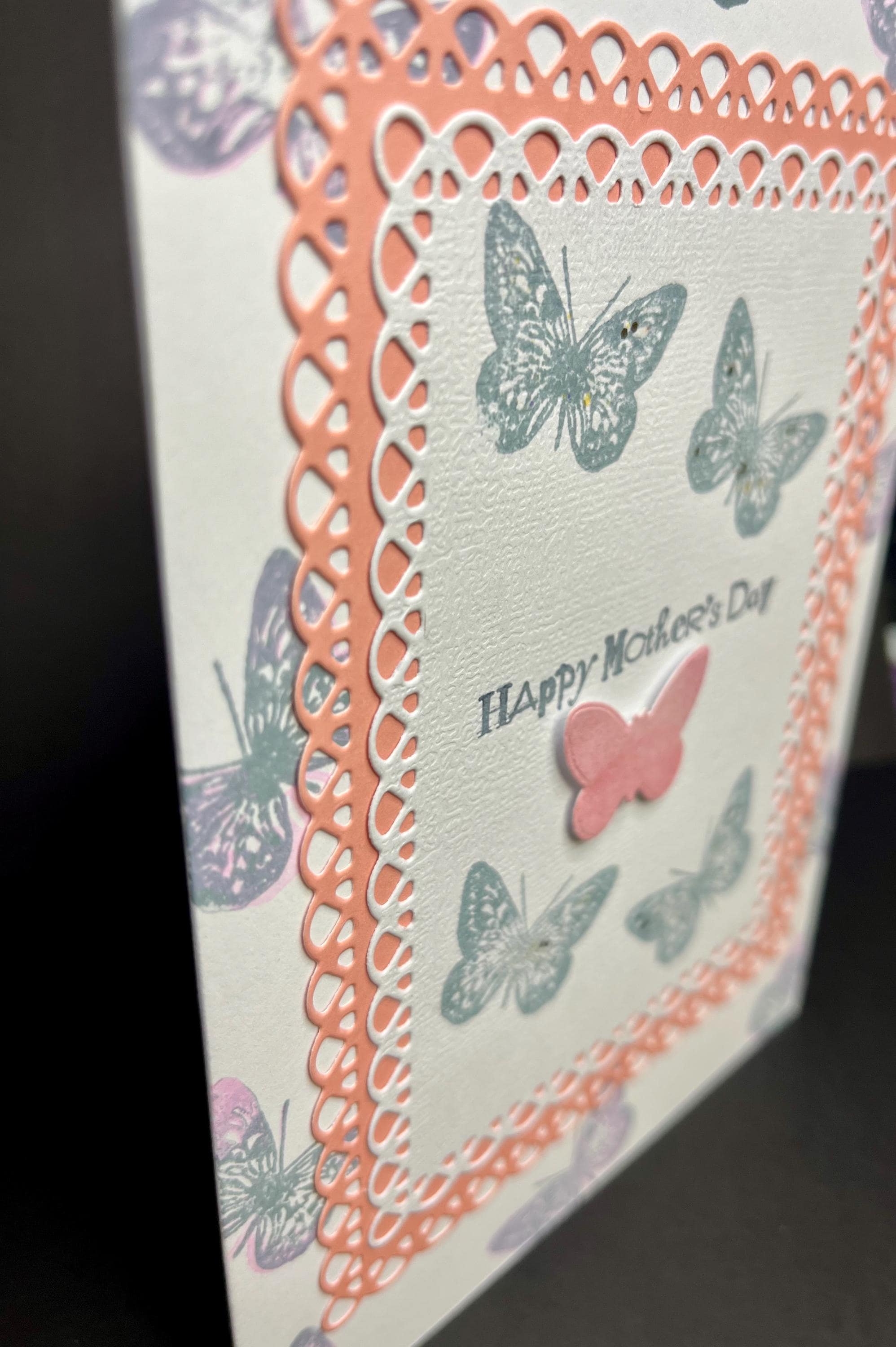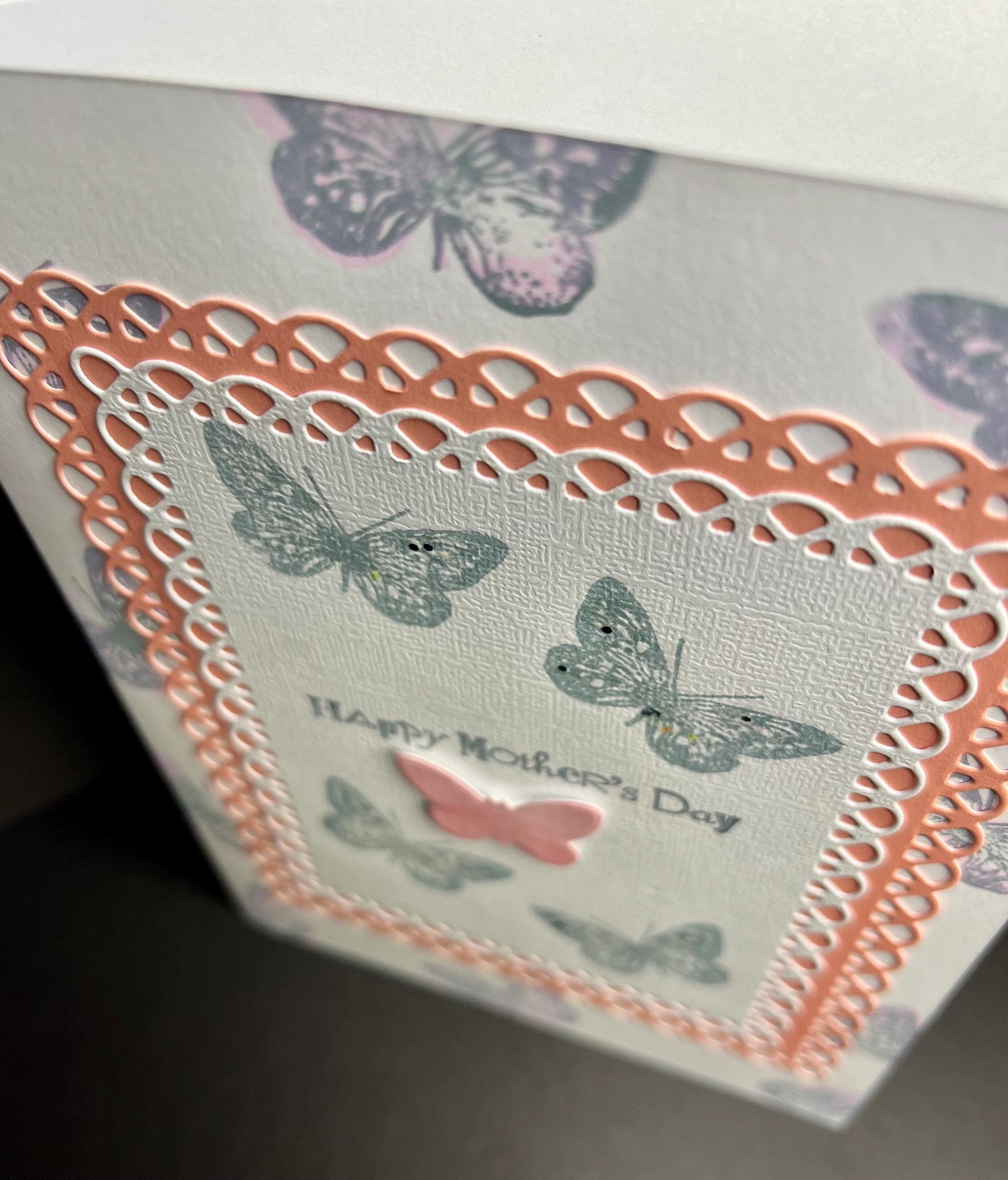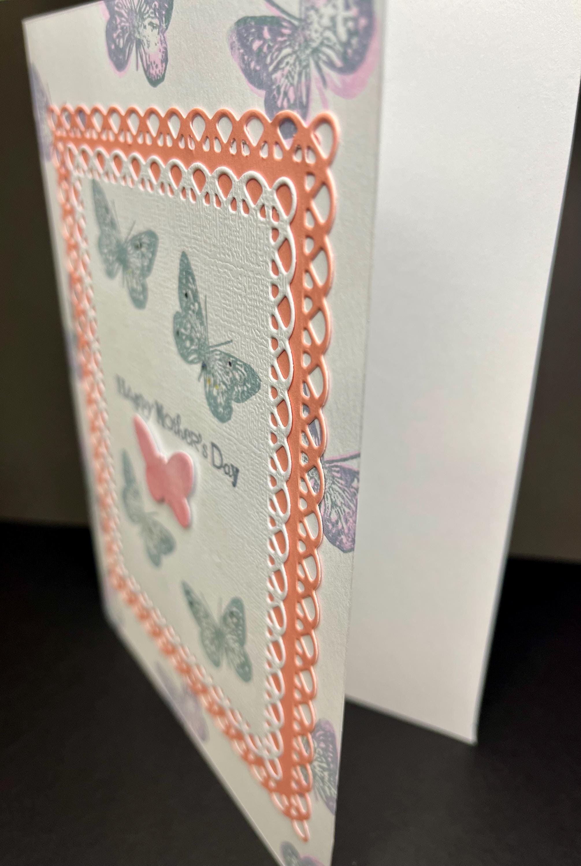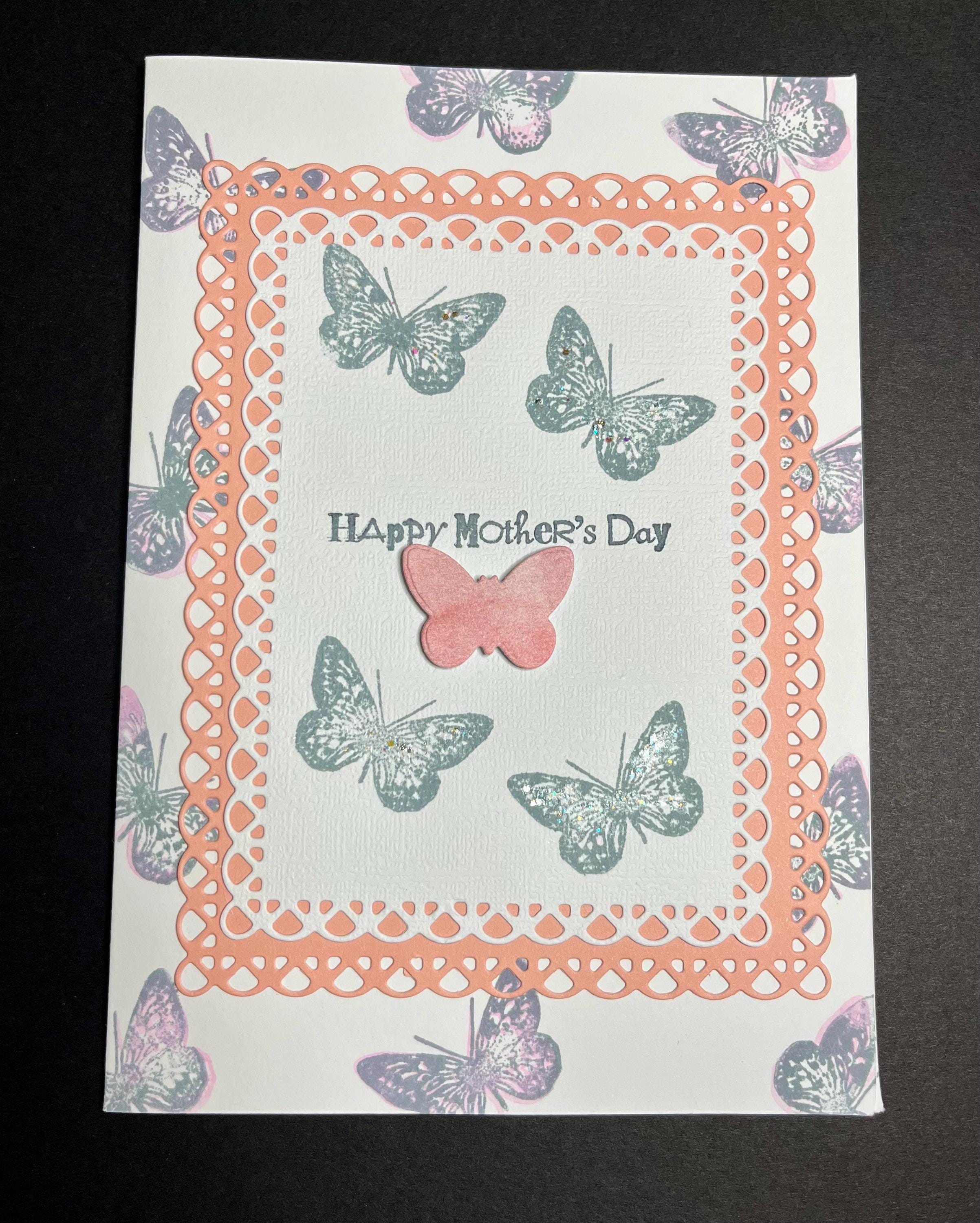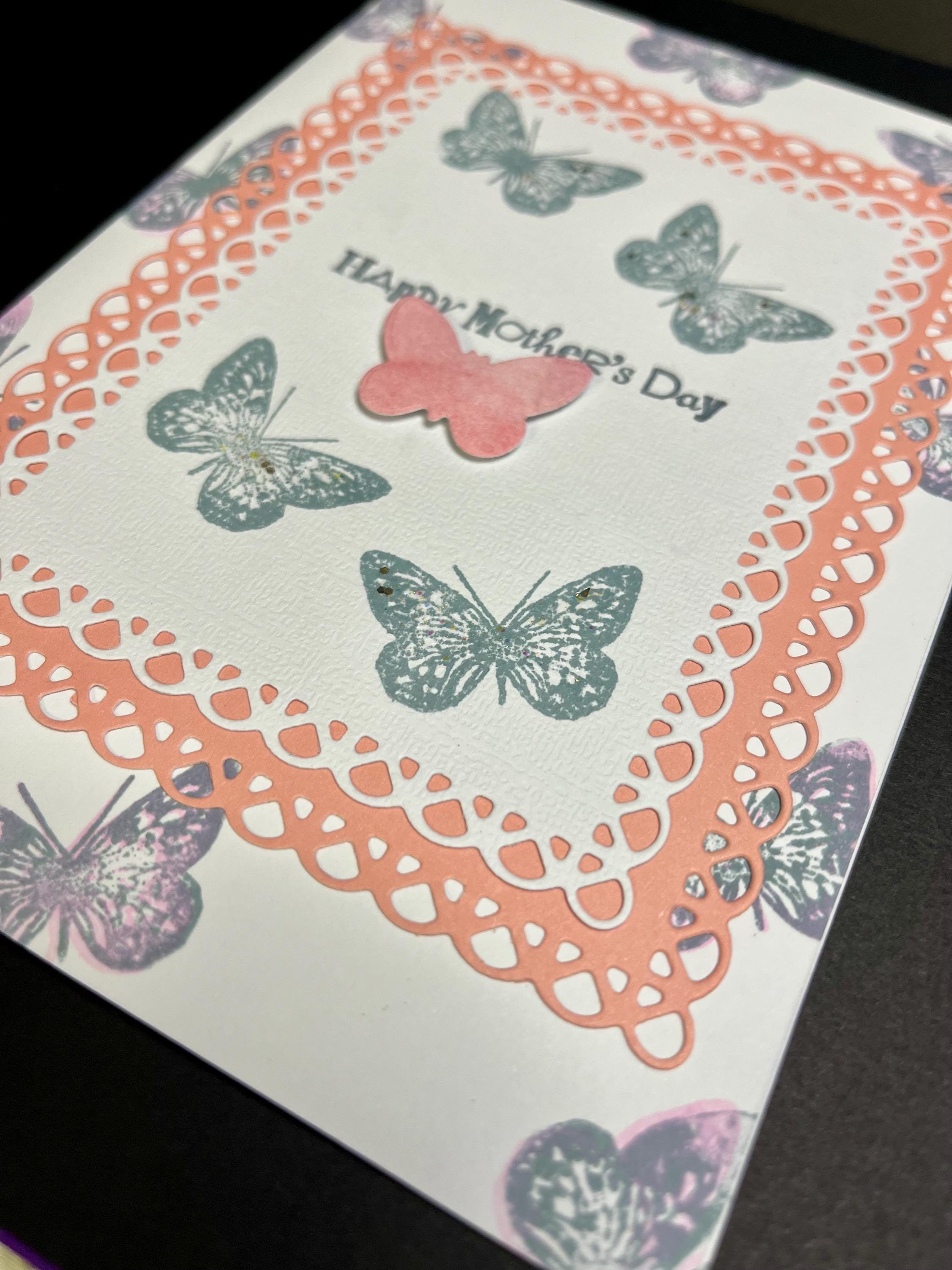 This is a 5x7 folded card with envelope. This card is blank inside so you can Express Yourself!š I layered a butterfly stamp with Tim Holtz distress ink colours stormy sky and Victorian velvet . Added a soft pink card stock that is die cut and one small butterfly.